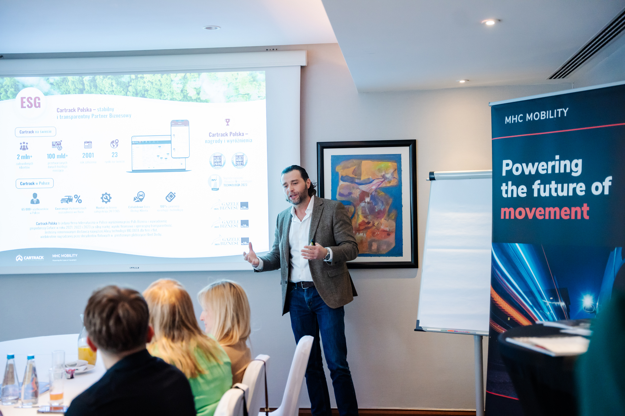 The meeting began with a warm welcome from Tomasz Piekarski, who introduced the topics and speakers. The first item on the agenda belonged to Mr. Jakub Farys from PZPM, who presented an analysis of the automotive market from 2023 and forecasts for 2024, focusing on the fleet sector. Next, Ms. Angelika Szufel from the CMS Law Office discussed ESG reporting issues in fleets, emphasizing the importance of the legal-regulatory aspect. The last presentation was given by Mr. Kamil Jakacki from CarTrack Poland, who presented the topic of non-financial reporting, highlighting the use of BIG DATA telematics technology.
