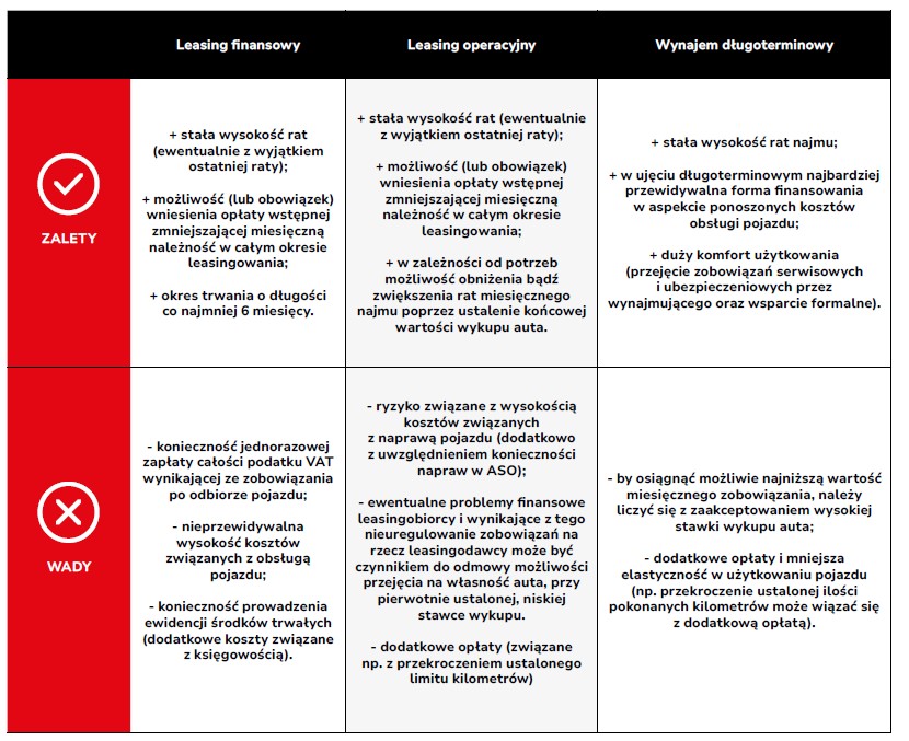 Biorąc pod uwagę wszystkie wymienione wyżej aspekty wyszczególnionych form finansowania pojazdu, trudno jednoznacznie określić, która forma leasingu będzie wariantem korzystniejszym. Zależy to przede wszystkim od indywidualnych potrzeb oraz możliwości leasingobiorcy. Zarówno w leasingu finansowym (poprzez określenie długości ewidencjonowania w środkach trwałych), jak i operacyjnym (poprzez uiszczenie bądź nie opłaty wstępnej, a także ustalenie końcowej wartości wykupu), wysokość miesięcznej raty można dopasować do warunków prowadzonego biznesu. Planując koszty należy mieć także na uwadze dodatkowe koszty związane z eksploatacją pojazdu, dlatego doskonałą alternatywą i jednocześnie kompromisem wydaje się być wynajem długoterminowy, który oprócz bezsprzecznych korzyści praktycznych, jednocześnie minimalizuje ryzyko wystąpienia nieprzewidzianych wydatków w długim okresie.