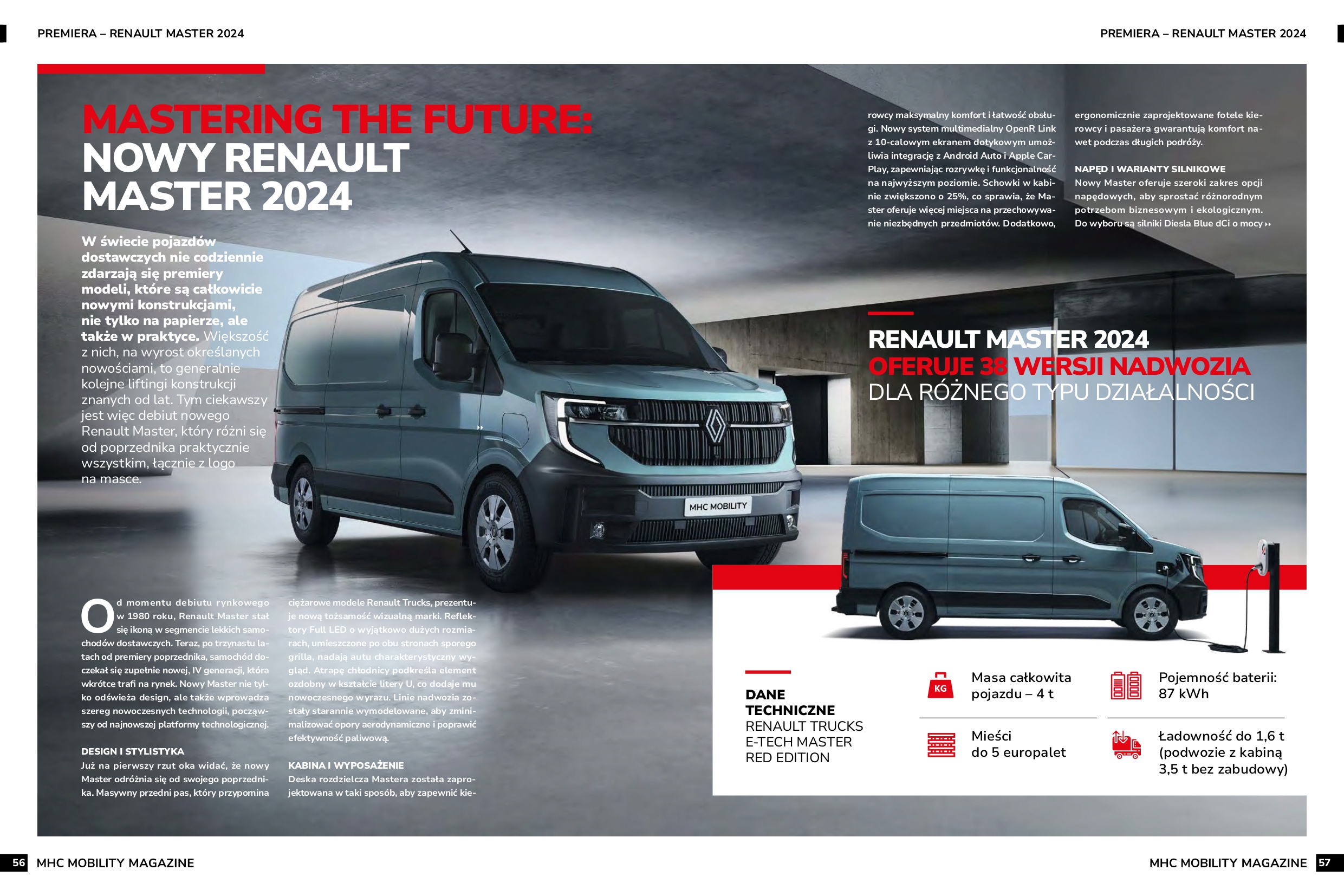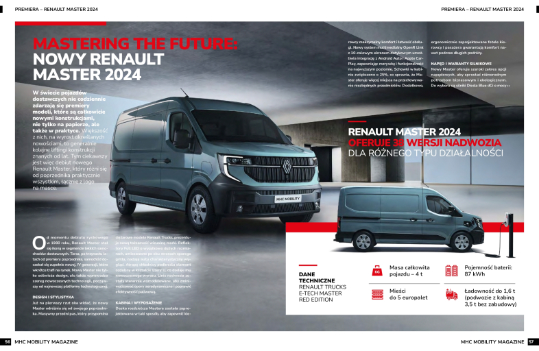 Nowy Master oferuje szeroki zakres opcji napędowych, aby sprostać różnorodnym potrzebom biznesowym i ekologicznym. Do wyboru są silniki Diesla Blue dCi o mocy od 105 do 170 KM oraz jednostki elektryczne o mocy 96 lub 105 kW. Nowoczesne akumulatory trakcyjne o pojemności 40 lub 87 kWh zapewniają imponujący zasięg, który w najbardziej pojemnym modelu sięga nawet 410 km wg WLTP. Dodatkowo, w przyszłości pojawi się wersja zasilana energią uzyskiwaną z wodoru, co sprawia, że Master staje się prawdziwie multienergetycznym pojazdem. Bez względu na wybrany napęd, Master zapewnia dynamiczną jazdę i efektywność paliwową na najwyższym poziomie.